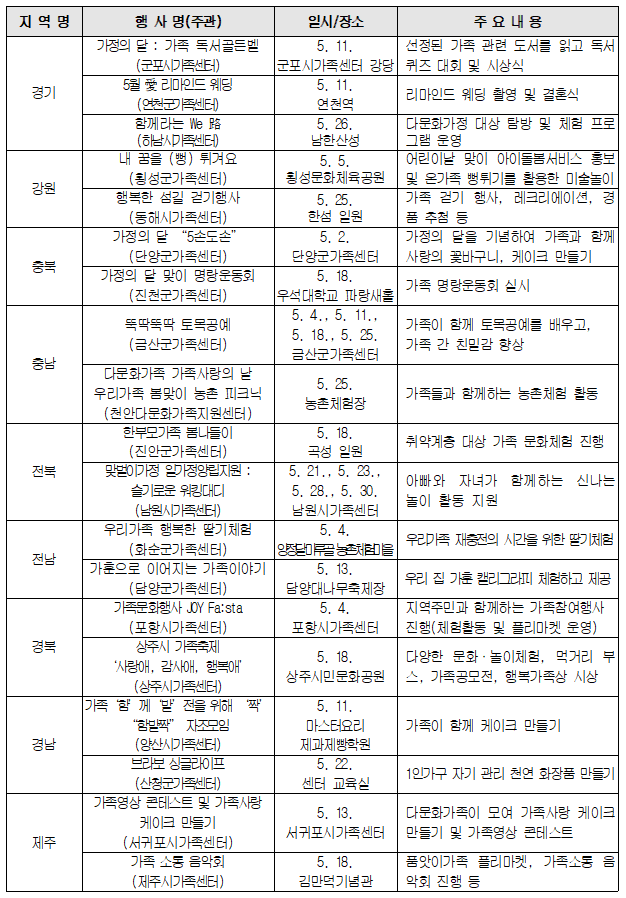 신영숙 여성가족부 차관은 “가정의 달을 맞아 전국 가족센터에서 열리는 온가족을 위한 행사와 프로그램으로 가족을 이해하는 따뜻한 시간을 갖길 바란다.”라며, “여성가족부는 앞으로도 다양한 가족이 일상에서 체감할 수 있는 가족서비스를 제공하기 위해 노력해나가겠다.”라고 말했습니다.