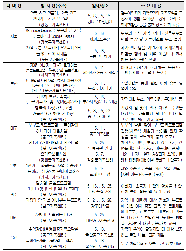 각 가족센터는 ‘가족 명랑운동회’(진천군가족센터), ‘가족 독서골든벨’(삼척시가족센터), ‘가족 소통 음악회’(제주시가족센터) 등 각종 문화‧체육행사와 ‘부자유친 프로젝트’(사천시가족센터), ‘둘이같이 하나 되어 처음처럼’(대구동구가족센터) 등 부모와 자녀, 부부간 교류 및 소통 증진 프로그램을 마련했습니다.