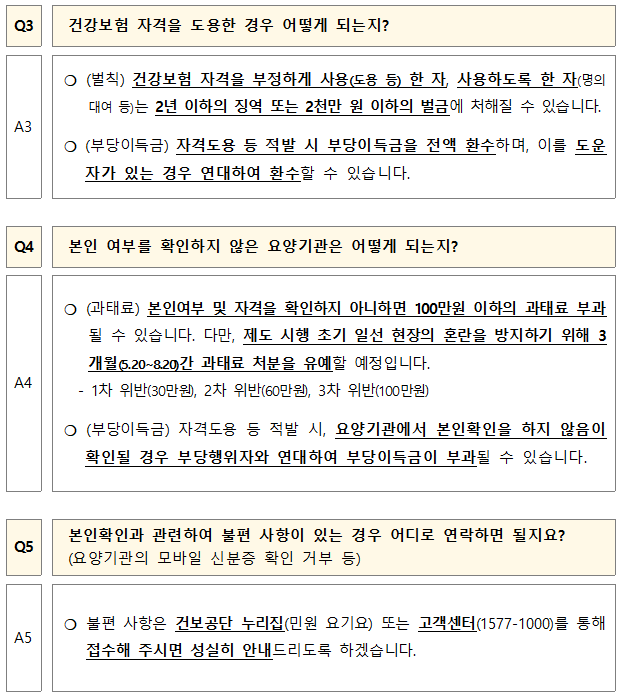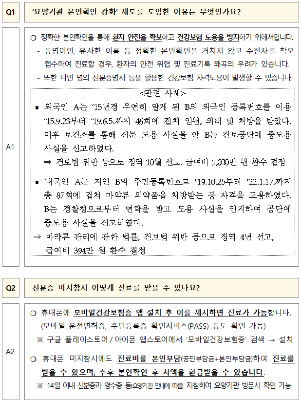 건강보험 자격을 부정하게 사용하는 경우 대여해 준 사람과 대여받은 사람 모두 2년 이하의 징역 또는 2천만 원 이하의 벌금에 처해질 수 있으며, 부정 사용한 금액을 환수합니다. 본인확인을 하지 않은 요양기관은 100만 원 이하의 과태료를 부과받게 됩니다. 건강보험 본인확인 제도에 대한 자세한 사항은 국민건강보험공단 누리집 또는 콜센터(1577-1000) 등을 통해 안내할 예정입니다. 이중규 건강보험정책국장은 “건강보험 본인확인 제도는 타인의 건강보험 자격을 도용하는 등 무임승차를 방지하여 건강보험제도의 공정성을 제고하기 위한 것”이라면서, “제도의 원활한 시행을 위해 국민 여러분께서는 의료기관 방문 시 신분증을 지참해 주시고, 미 지참하신 경우 모바일 건강보험증 앱을 이용해주시기를 부탁드린다”라고 밝혔습니다.