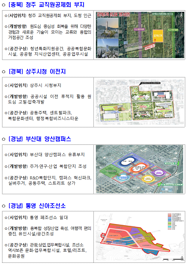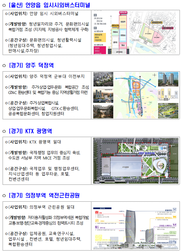 “지자체가 공간재구조화계획 수립, 사업시행자 선정, 개발사업 인·허가 등 앞으로의 절차를 차질 없이 진행할 수 있도록 지원하겠다”라고 밝혔습니다.