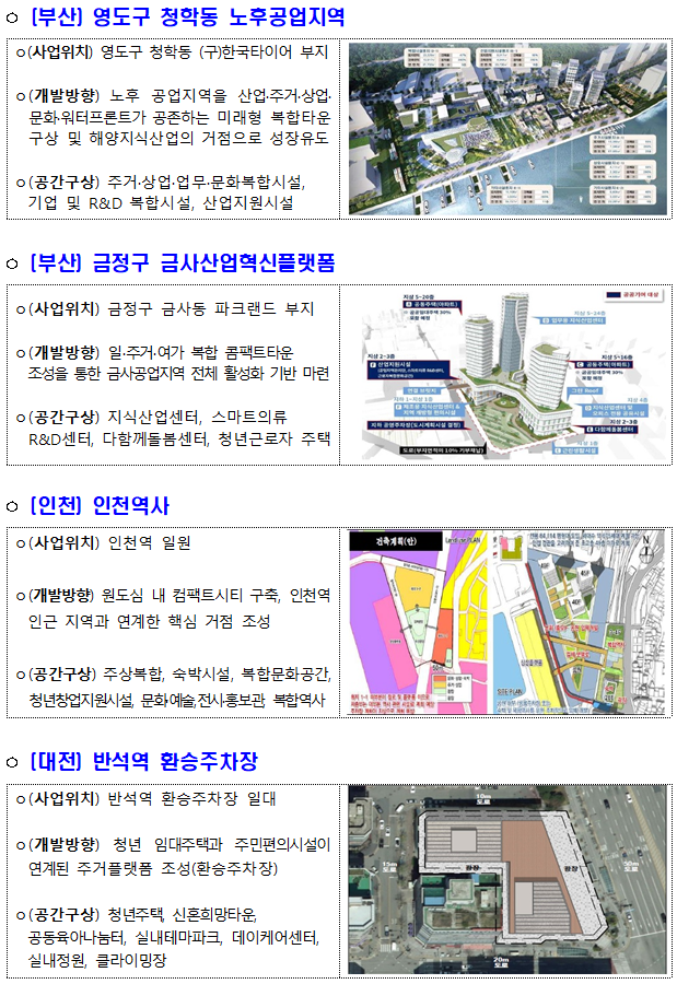 특히, 기존 도심 내에서 변화를 이끌어 낼 수 있는 잠재력, 부지 확보 가능성, 지자체의 추진 의지 등을 중점적으로 검토하였습니다.
