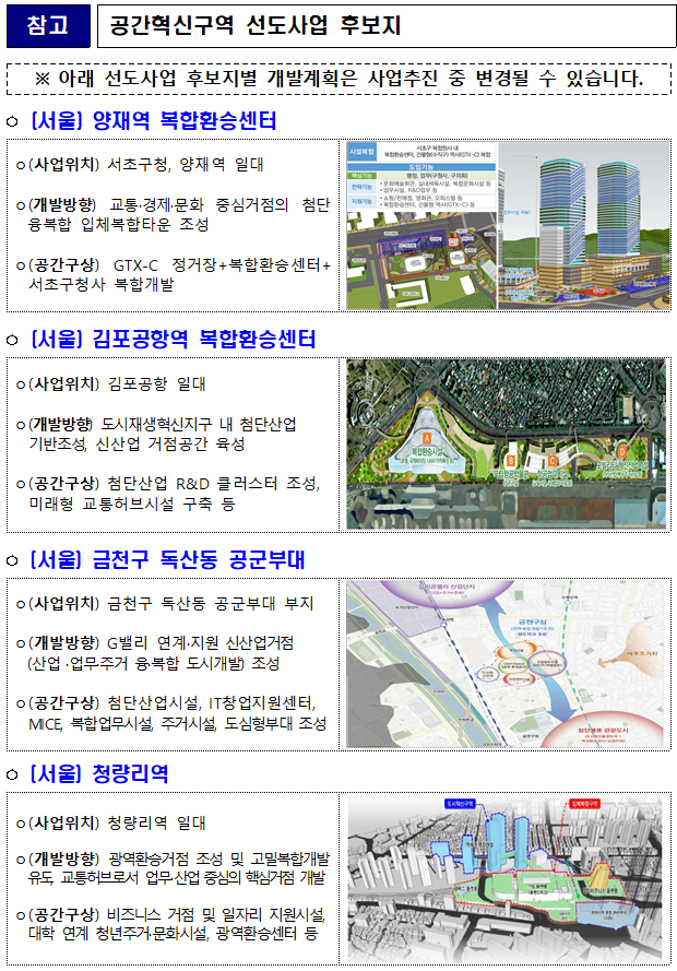 후보지는 현 시점에서의 필요성, 실현 가능성 등을 고려한 것이며, 이번에 선정되지 않았더라도 향후에 지자체에서 여건 변화 등을 고려하여 공간재구조화계획 수립을 거쳐 공간혁신구역으로 지정할 수 있습니다.