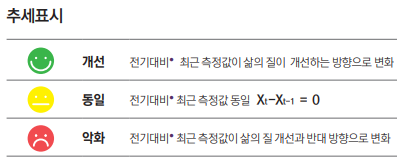 지표별로 생산주기와 지표방향이 다르므로, 최근 측정값을 전기대비 측정값과 비교하여 각 지표가 삶의 질 에 기여하는 방향에 따라 ‘개선’, ‘악화’, ‘동일’ 세 개로 구분됩니다. 예를 들면 ‘고용률’ 지표의 경우 측정값이 증가하면 삶의 질이 개선됨으로 ‘개선’ 으로 판정됩니다. 반면, ‘실업률’ 지표의 경우 측정값의 증가가 삶의 질의 개 선이 아니므로, ‘악화’로 표시됩니다. 즉 지표 측정값의 전기대비 변화가 삶의 질에 어떻게 기여하는지로 판정됩니다.