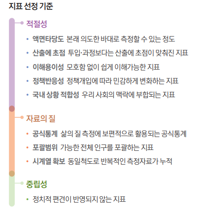 국민 삶의 질 지표는 각 영역별로 객관적 지표와 주관적 지표를 포함하며 , 선정 기준에 따라 삶의 질과 관련성이 높은 지표로 구성됩니다. 지표는 크 게 적절성, 자료의 질, 중립성을 기준으로 선정됩다.