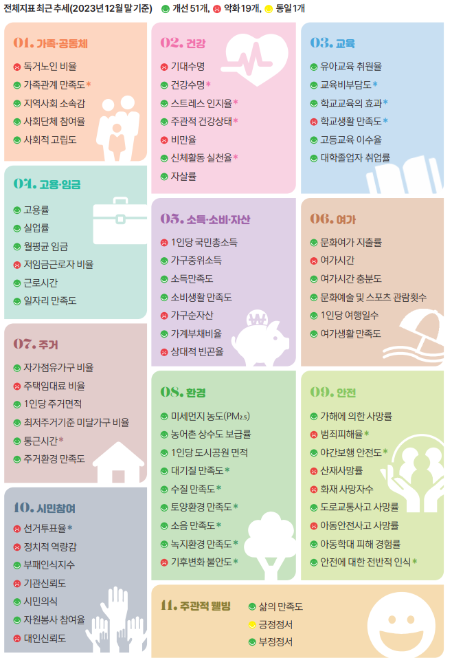 국민 삶의 질 지표는 중장기적인 삶의 질 변화를 살펴보기 위한 것으로 월 간이나 분기별로 나타나는 최근 동향이 아닌 연간자료를 활용해 우리 사회 의 삶의 질을 모니터링하고 있습니다. 국민 삶의 질 지표는 다양한 출처에서 작 성되는 통계자료를 활용하고 있어 지표별로 작성주기와 공표시점, 업데이 트 시기가 서로 상이합니다.