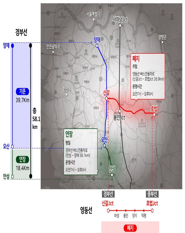 - 토요일·공휴일에 운영 중인 영동선 버스전용차로 신갈~호법 구간은 폐지