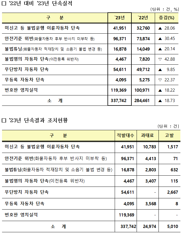 23년 불법자동차 주요 위반행위 별 단속 내용