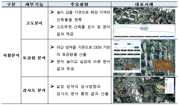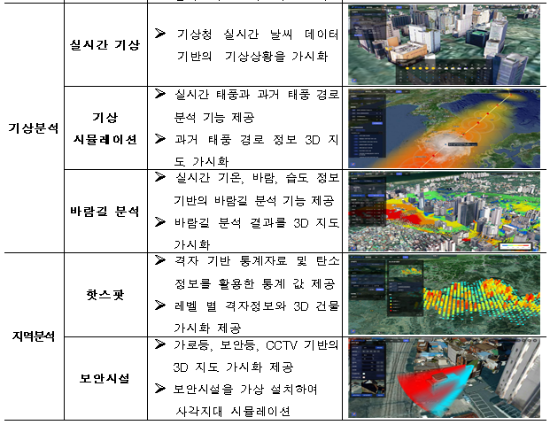 - 고도화 1차 적용 성과에서 구축한 3개 분야(경관, 지형, 건물) 9개 기능을 5개 분야(경관, 지형, 건물, 기상, 지역) 16개 기능으로 확대
