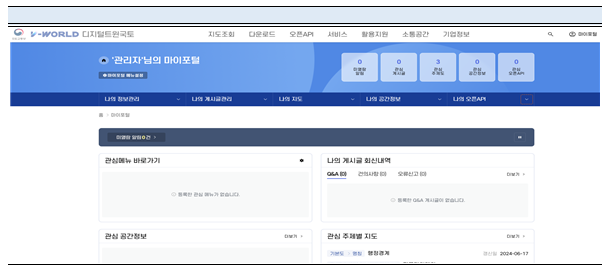- 회원정보, 게시글, 관심 주제도·지역·공간정보, 공간정보 다운로드 내역, 인증키 관리 등 나만의 정보를 한눈에 확인할 수 있는 메뉴 적용
