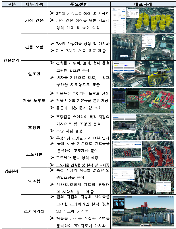 - 고도화 1차 적용 성과에서 구축한 3개 분야(경관, 지형, 건물) 9개 기능을 5개 분야(경관, 지형, 건물, 기상, 지역) 16개 기능으로 확대