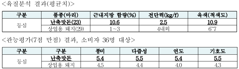 ‘난축맛돈’은 육질이 좋은 ‘제주재래흑돼지’와 번식능력과 성장이 뛰어난 ‘랜드레이스’ 품종을 활용해 2013년 개발되었습니다. 국립축산과학원이 세계 최초로 구명한 제주재래흑돼지에서 맛 관련 유전자(MYH3 변이)를 적용해 개발했습니다. ‘난축맛돈’은 근내지방 함량이 10% 정도로 높아 육질이 특히 부드럽고 수분을 보존하는 능력이 우수해 가열할 때 수분 빠짐이 적습니다. 무엇보다 삼겹살과 목심 외에 저지방 부위로 알려진 등심, 뒷다리 등 비선호 부위도 구워 먹을 수 있다는 게 큰 장점입니다. 국립축산과학원 난지축산연구소에서 ‘난축맛돈’을 보급하고 있으며, 2023년까지 798마리(암 728마리, 수 70마리)를 보급했습니다. 현재 ‘난축맛돈’ 인증 식당(12개소) 등 전국 약 40곳에서 판매하고 있고, 온라인 상점에서도 구할 수 있습니다. 난축맛돈 씨돼지 분양을 원하는 농가나, 고기를 구매하고 싶은 소비자는 국립축산과학원 난지축산연구소(064-754-5714)로 문의하면 됩니다.