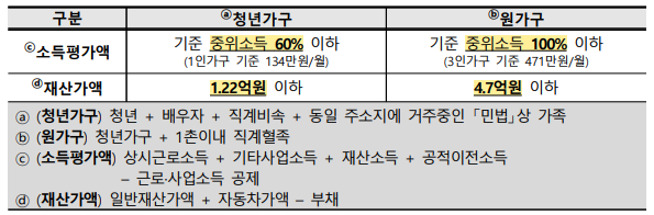 요건 :  (청년가구) 중위소득 60% 이하, 자산 1.22억 이하 / (원가구) 중위소득 100% 이하, 자산 4.7억 이하