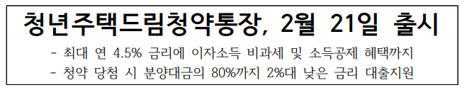 청년주택드림청약통장은 2월 21일부터 전국 주택도시기금 수탁은행 지점에서 신청가능하며, 출시에 맞춰 은행별로 모바일 쿠폰, 경품 등 다양한 가입행사도 진행할 예정입니다.