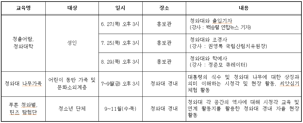 문화체육관광부(이하 문체부)는 청와대재단(이하 재단)과 함께 청와대 개방 2주년을 맞이해 6월부터 11월까지 청와대의 역사·문화적 가치를 알리고 공유하는 맞춤형 교육프로그램을 운영합니다. 자세한 내용은 아래와 같습니다.