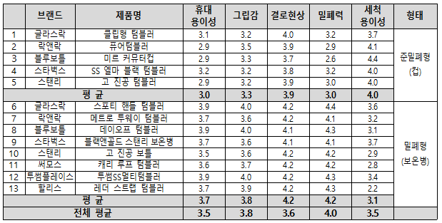 휴대용이성, 밀폐력, 그립감, 결로현상에서는 밀폐형이 준밀폐형에 비해 상대적으로 평가점수가 높았으며, 세척용이성에서는 준밀폐형의 점수가 더 높았습니다.