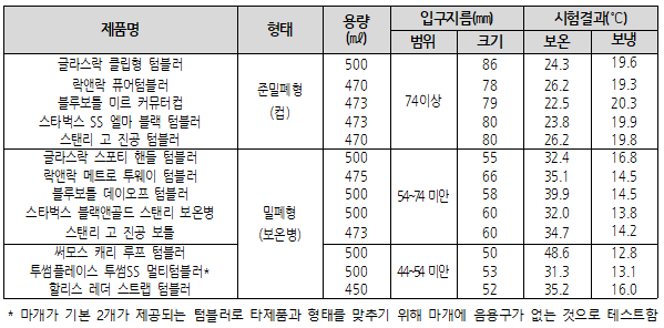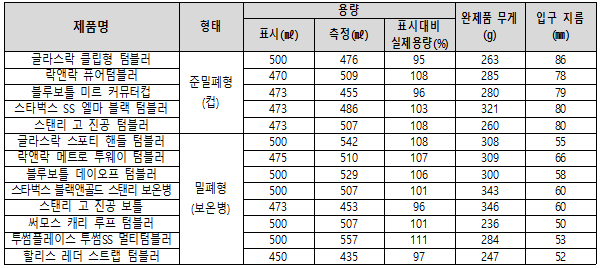 시험 대상 제품의 무게는 236g~346g으로 최대 110g의 차이가 있었고, 입구 지름은 준밀폐형(78~86) 밀폐형(50~66)보다 넓어 얼음이나 음료를 담기가 쉬웠으며, 입구가 가장 넓은 글라스락(클립형 텀블러)제품과 가장 좁은 제품 써모스(캐리 루프 텀블러)의 차이는 36였습니다.
