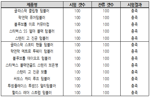 밀폐형 텀블러 8종은 누수가 발생 되지 않았고, 준밀폐형 5종 모두 마개가 열리지 않았으며, 3종에서 약간의 유출이 발생하였으나 유출량이 기준에 충족하였습니다.