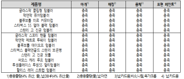 텀블러 마개는 PP(폴리프로필렌) 소재가 가장 많이 사용되었고, PCT(폴리시클로헥산-1,47-디메틸렌 테레프탈레이트), 금속제, ABS(아크릴로니트릴-부타디 엔-스티렌공중합체) 등과 같이 소재가 2개 이상 혼합된 제품도 있었음. 패킹은 모든 제품이 고무제, 몸통은 모두 금속제였습니다.