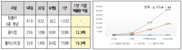 ▲  (환경성) 텀블러와 일회용 컵 환경 영향 평가, 탄소배출량 최대 16.5
