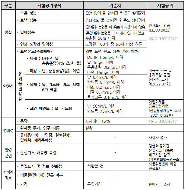 음료를 따뜻하게 또는 차갑게 유지하는 것으로 제품 선택 시 주요 고려요인이지만 현재 텀블러 특성에 맞는 시험방법과 기준이 없어, 보온 성능은 KS G 3200:2017(스테인리스강 진공 보온병), 보냉 성능은 환경표지인증(EL333:2022) 준용하여 시험하였습니다.