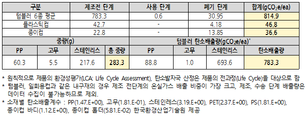 마개, 패킹, 몸체가 각각 PP(폴리프로필렌)와 고무, 스테인리스 소재로 구성된 텀블러 6종을 기준으로 탄소배출량 계산 시, 1개의 텀블러를 생산하기 위해 평균 783.3 gCO2e의 탄소가 배출되는 것으로 확인됩니다.