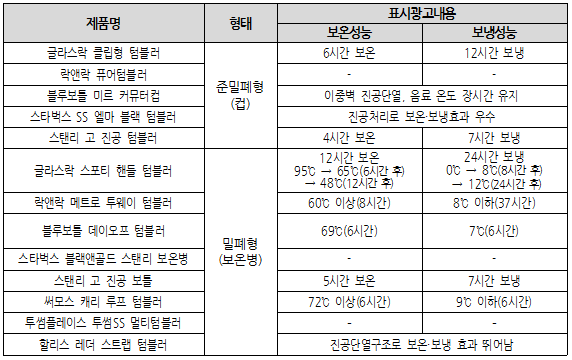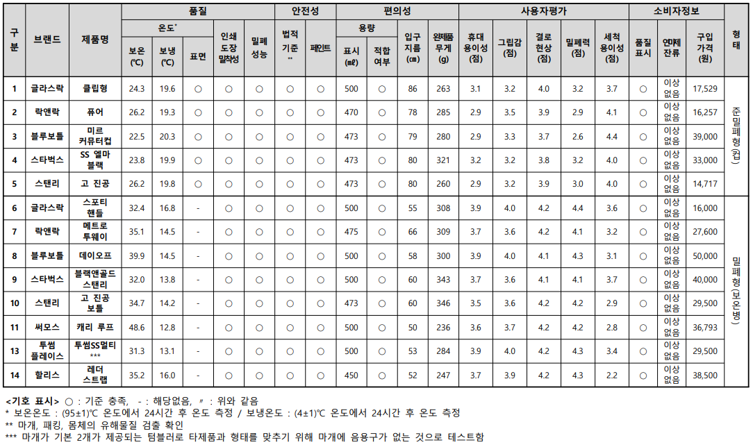 시험 결과, 보온·보냉 성능, 사용 편의성은 제품 형태별(준밀폐형, 밀폐형), 제품별 차이가 존재했습니다. 시험대상 제품 모두 안전성 및 표시기준을 준수하였으며, 스테인리스 제조 시 사용되는 연마제도 세척으로 제거 가능한 것으로 나타났습니다.