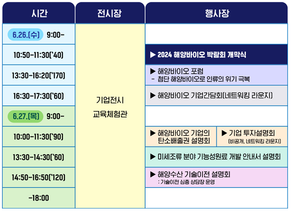 ㅇ 주요내용: 기업 전시, 해양바이오 포럼, 해양수산 기술이전 설명회, 기업 투자설명회, 교육·체험관 등