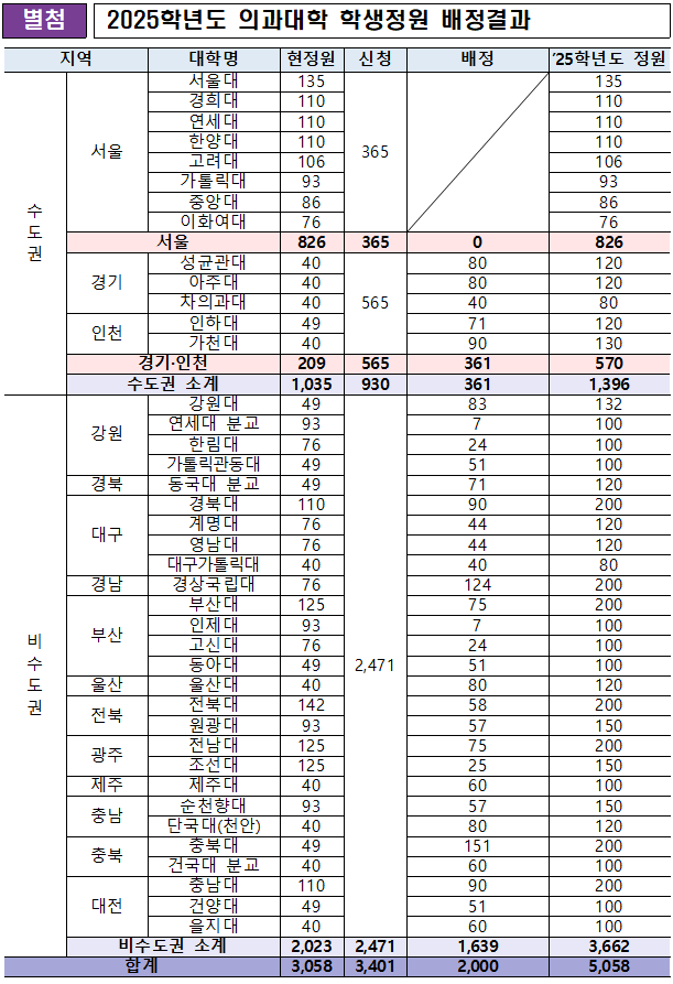 * 배정원칙비수도권 의대 집중배정 소규모 의과대학 교육역량 강화 지역필수의료 지원 및 각 대학 수요와 교육역량 종합 고려
