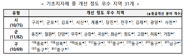 특히, 기초지자체 31개 지역(시 10개, 군 11개, 구 10개)은 3개 분야 이상에서 등급 상승이 이루어졌으며, 특히 경기 구리, 인천 옹진의 경우 5개 분야에서 등급이 상승하였습니다.
