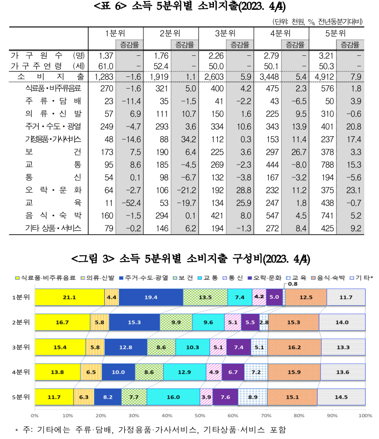 소비지출 비중은, 소득 1분위 가구는 식료품·비주류음료(21.1%), 주거·수도·광열(19.4%), 보건(13.5%) 순이고, 소득 5분위 가구는 교통(16.0%), 음식숙박(15.1%), 식료품·비주류음료(11.7%) 순이었습니다.