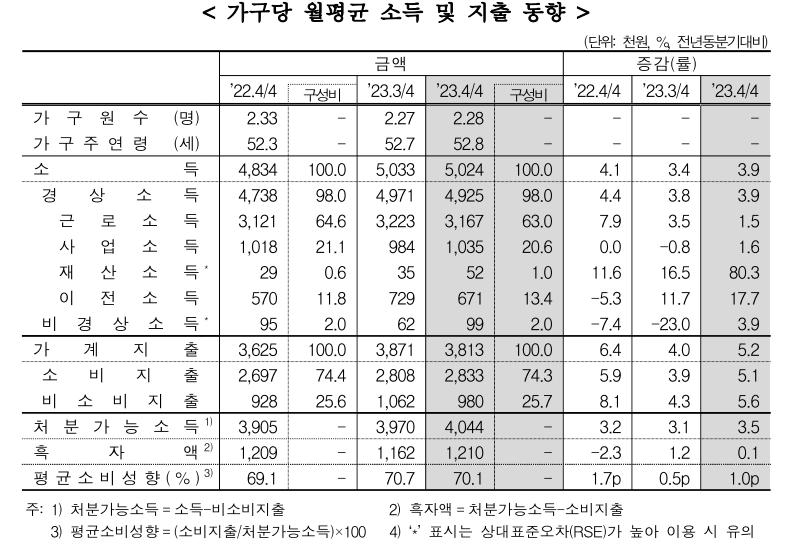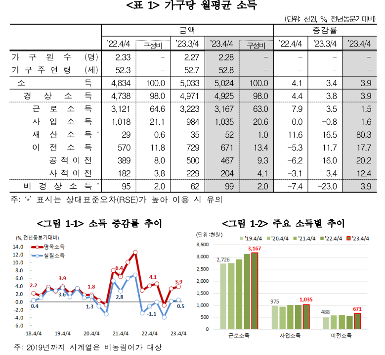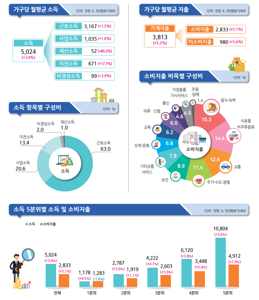 가구당 월평균 소득은 5024천원으로 전년동분기대비 3.9% 증가하였습니다.