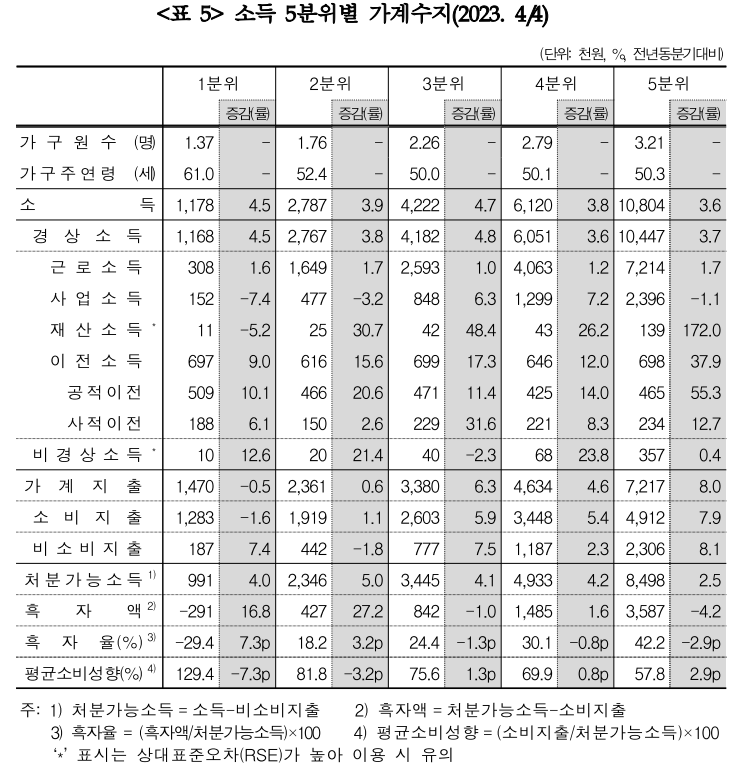 1분위 가구의 처분가능소득은 991천원으로 전년동분기대비 4.0% 증가하였고 평균소비성향은 129.4%로 전년동분기대비 7.3%p 하락하였습니다. 5분위 가구의 처분가능소득은 8498천원으로 전년동분기대비 2.5% 증가하였고 평균소비성향은 57.8%로 전년동분기대비 2.9%p 상승하였습니다.