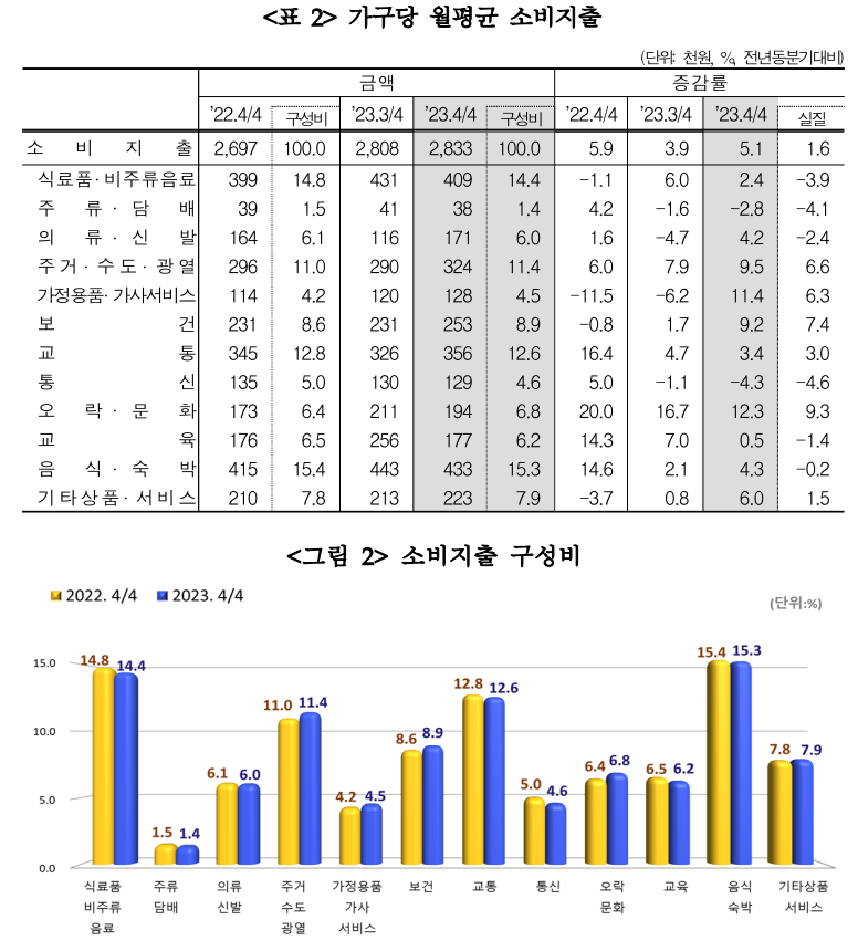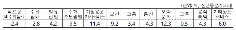 주거·수도·광열(9.5%), 보건(9.2%), 오락문화(12.3%), 음식·숙박(4.3%) 등은 지출 증가, 통신(-4.3%), 주류·담배(-2.8%) 지출은 감소하였습니다.