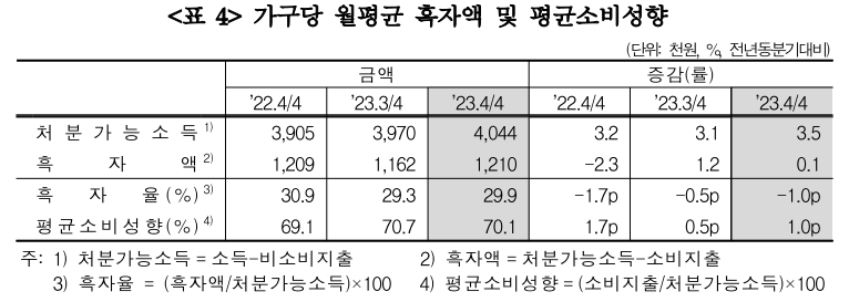 처분가능소득은 4044천원으로 전년동분기대비 3.5% 증가, 흑자액은 121만원으로 0.1% 증가하였습니다.