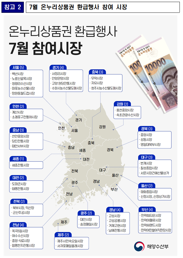 먼저, 주요 관광지 수산 시장과 전통시장 등에서 국산 수산물을 구매한 소비자들에게 구매금액에 따라 최대 2만 원까지 온누리상품권을 지급하는 ‘7월 온누리상품권 환급행사’를 개최합니다. 이번 행사는 7월 6일(토)부터 12일(금)까지 전국 50개 전통시장에서 진행됩니다. 소비자는 행사 참여 시장에서 국산 수산물을 구매한 후 영수증과 신분증을 지참하여 시장 내 환급 부스에 가면 간단한 본인 확인 후 온누리상품권을 환급받을 수 있습니다.
